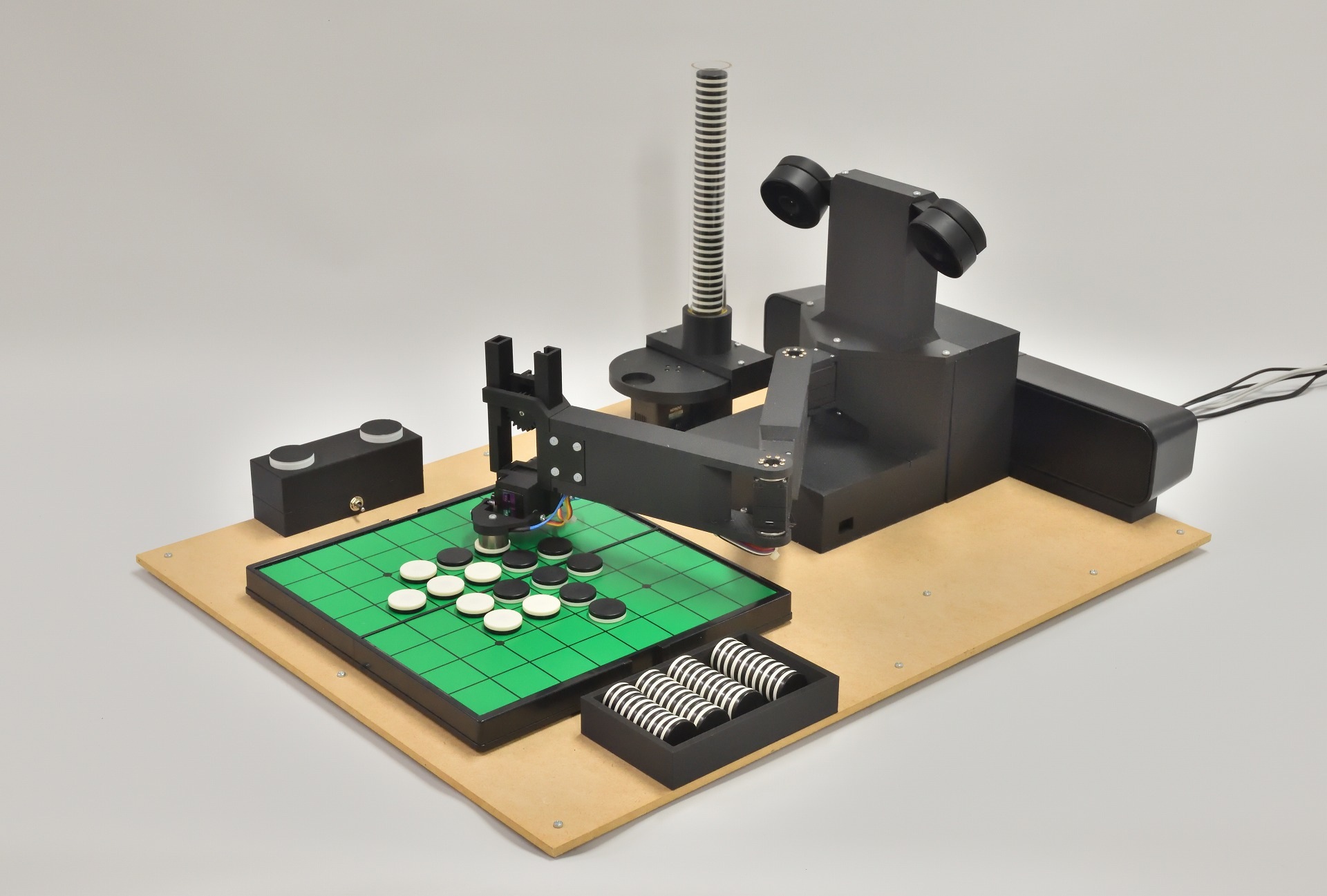The robot recognizes the board with two cameras and manipulates the pieces with an arm equipped with an electromagnet. It uses a chess clock-style device to conduct a teaching game with a human.