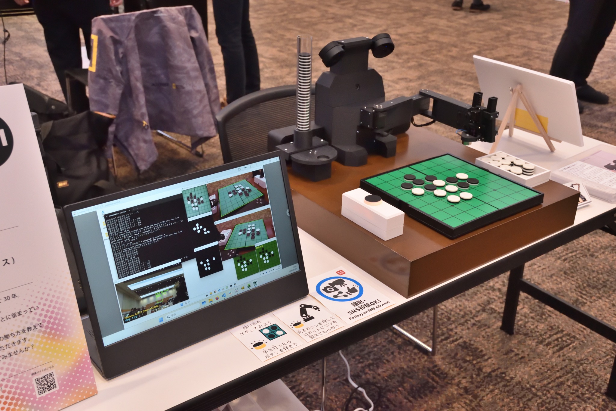 世界チャンピオンにオセロAIが勝利してからもうすぐ30年。オセロAIは強さという面ではほぼ完璧になりました。しかし、AIができることはただ強い手を見つけることに留まっています。もし、強いAIがロボットの体を持って、オセロの勝ち方を教えてくれる未来があったら?そんな未来を体験していただきます。ロボットのアドバイスを参考に、オセロを打ってみませんか?