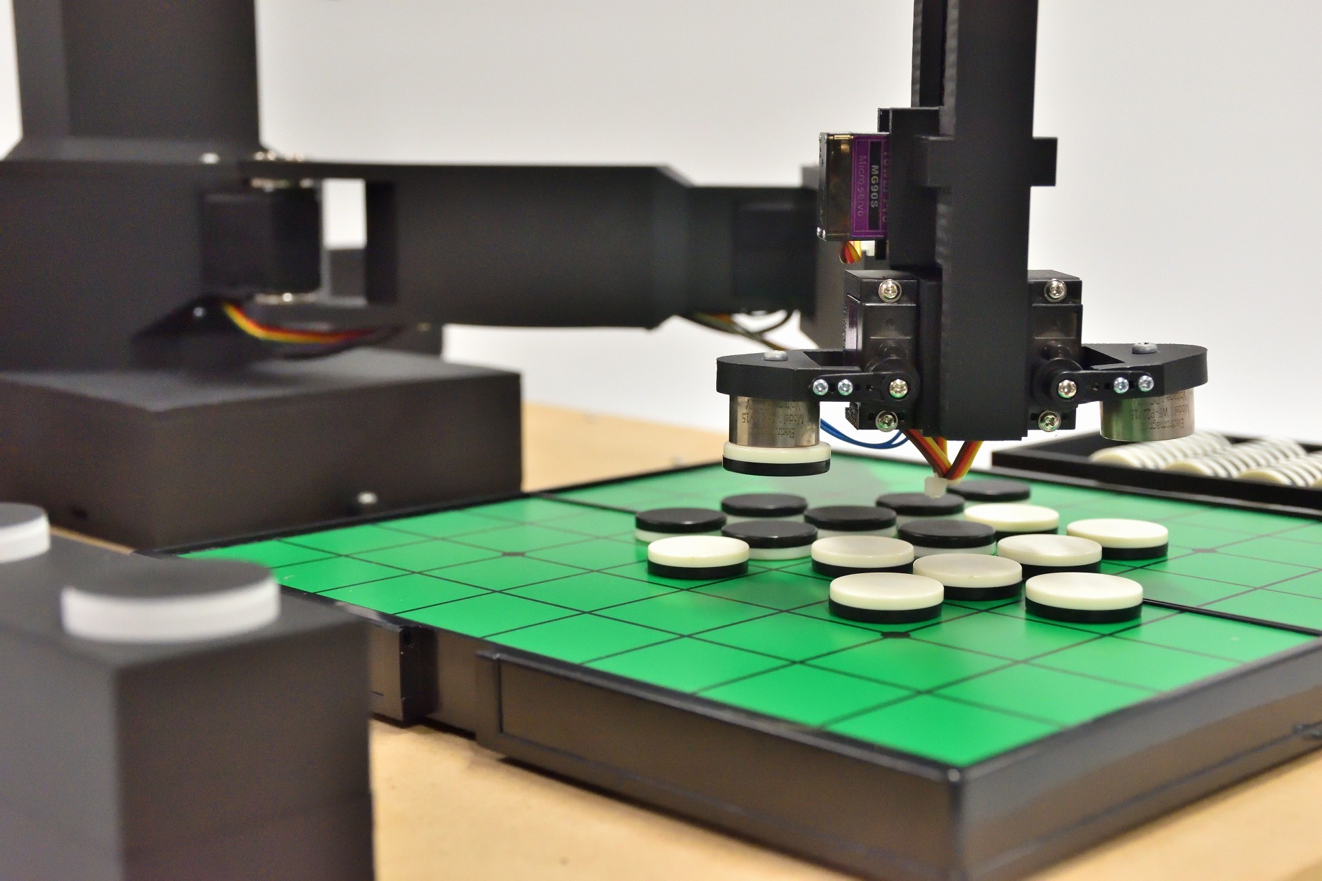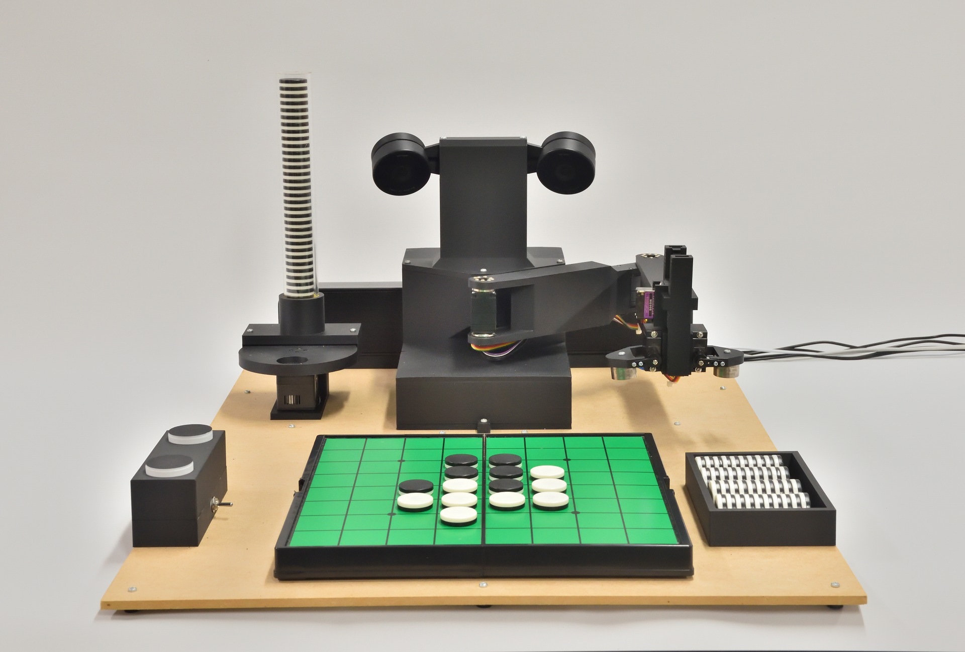 ロボットは2台のカメラで盤面を認識し、電磁石のついたアームで石を操ります。対局時計風デバイスを使って、人間に対して指導対局を行います。
